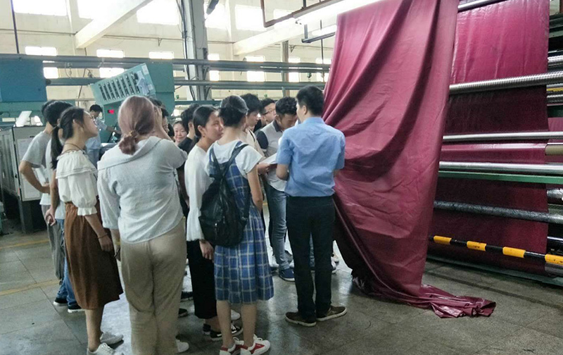 第二站,學(xué)生參觀涂層廠。涂層廠技術(shù)科主管莊培釗向?qū)W生介紹布料涂層處理技術(shù),展示制作成品,并由技術(shù)工人向?qū)W生示范操作壓光機(jī)。